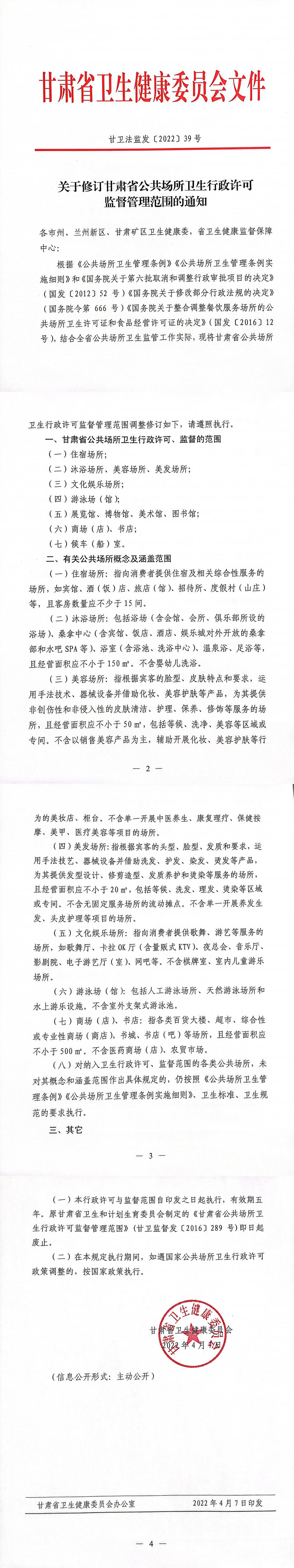 关于修订甘肃省公共场所卫生行政许可监督管理范围的通知