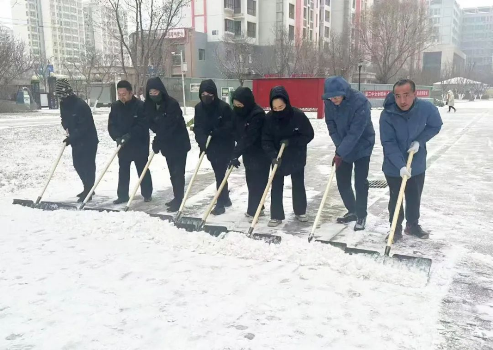 兰州新区新中实业发展有限责任公司各项目物业人员以雪为令立即对各项目重点道路、主干道、人行道、广场等区域的积雪进行清理。公司还派出专业人员巡检设施设备,从水电管网至游乐器械,逐处细查,防寒保暖、加固调试,不容丝毫差错,力保低温下运转如常,暖居基石稳固。